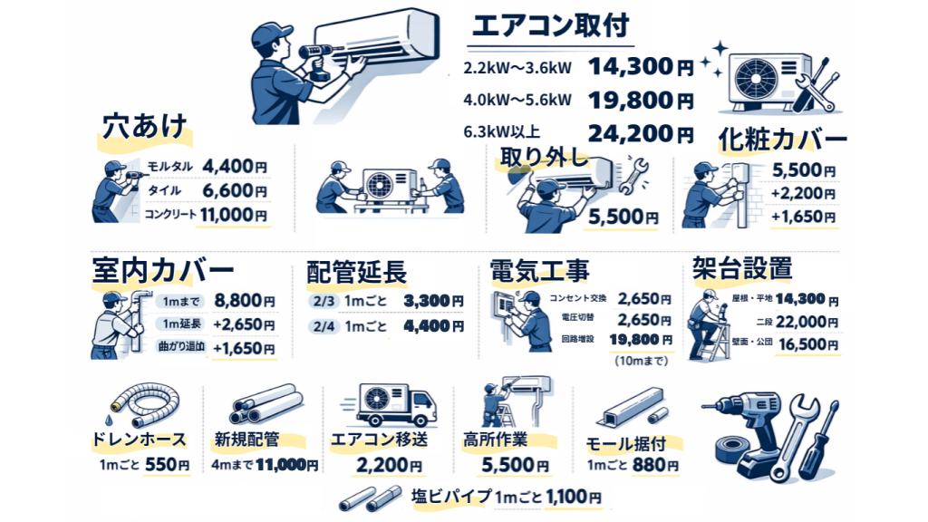 配管4mまで/穴あけ1箇所/ドレンホース5mまで/テープ巻き仕上げ/外穴パテ仕上げ/室外機(庭置き・ベランダ置き)/内外機同一階設置/真空引き